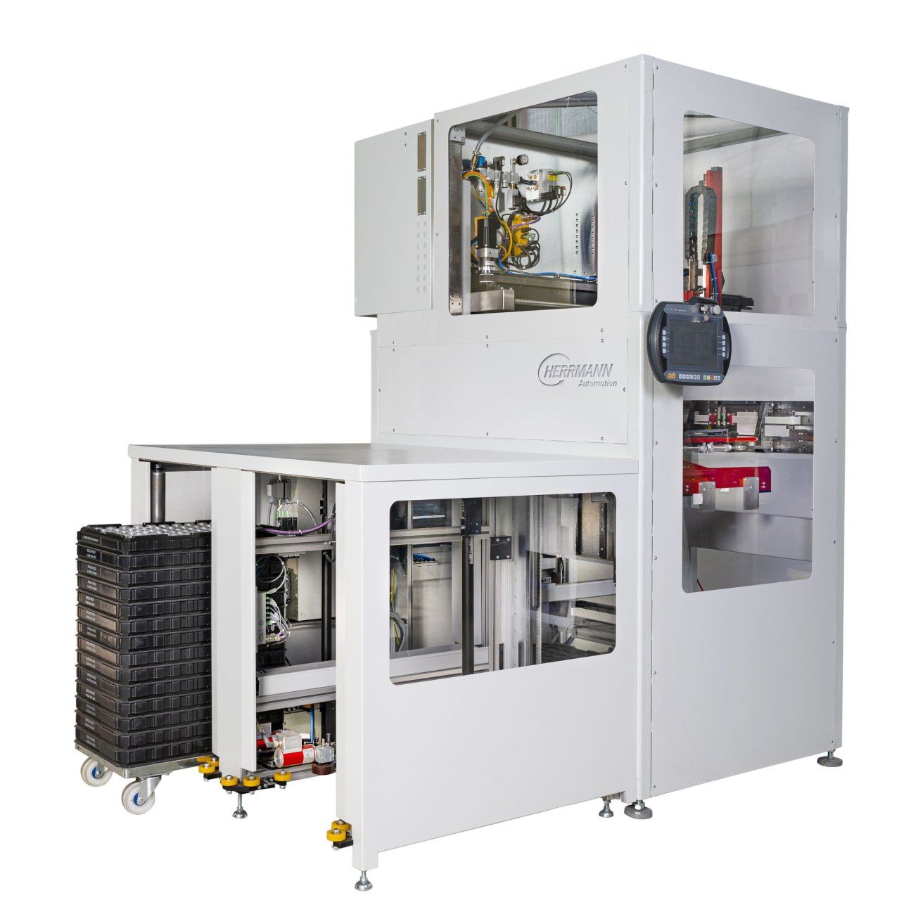 Das Palettiersystem der Fa. Herrmann überzeugt durch kompaktes Design und gute Zugänglichkeit von allen Seiten.